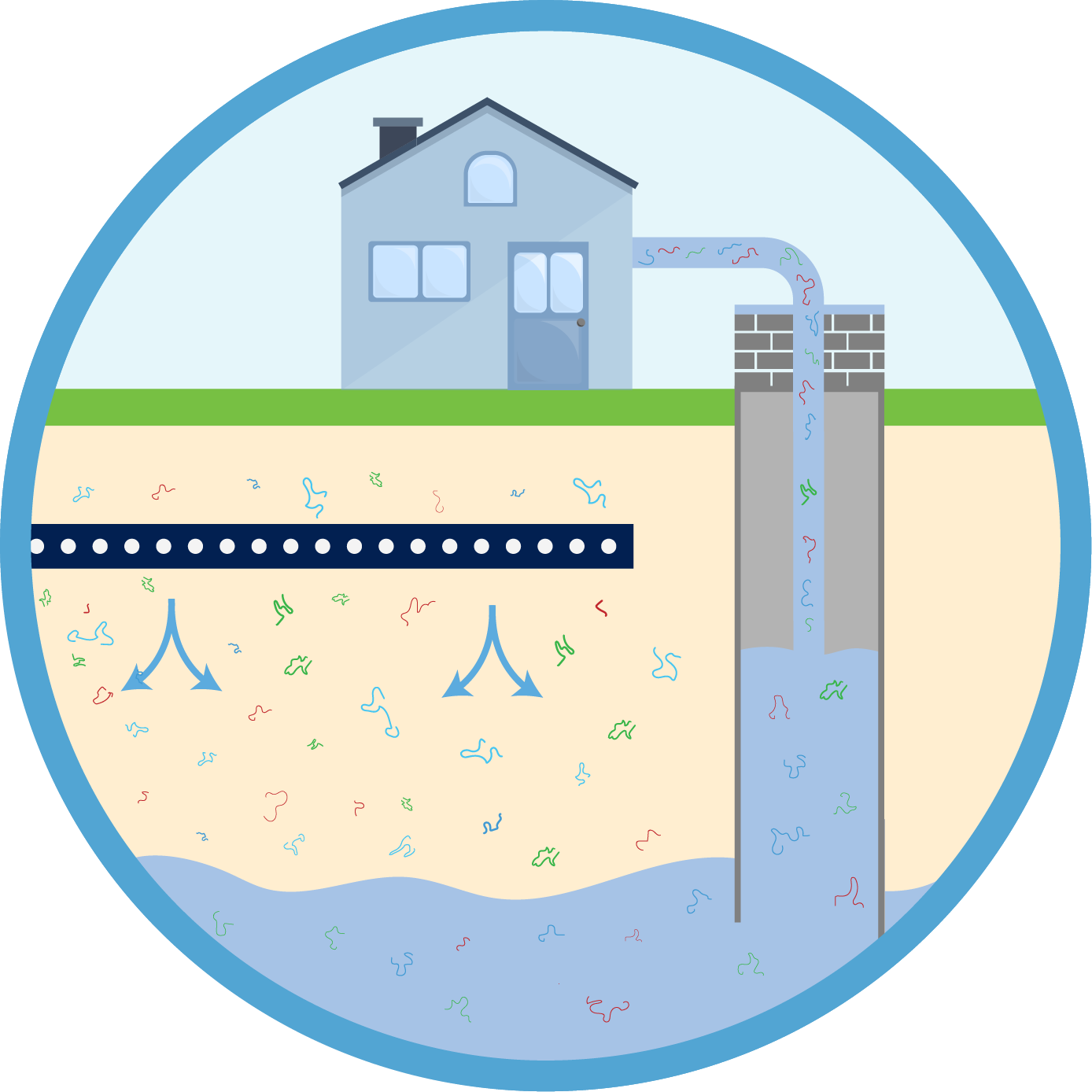 Yes. Effluent from septic systems flows into surrounding soil and eventually into groundwater. Since most private wells draw from the same aquifer, tiny fibers can travel through soil pores, breaking down even smaller and ending up in drinking water, carrying chemicals and bacteria with them.