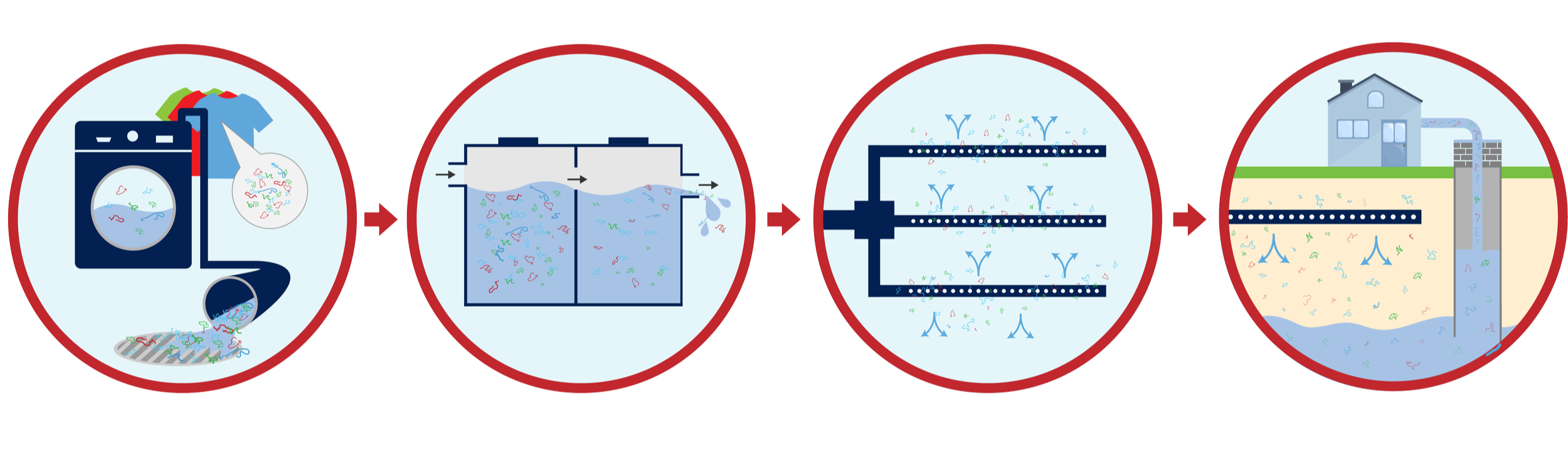 No. Septic tanks are designed to settle out heavy solids, but microplastic fibers from laundry are lightweight and stay suspended. They often pass into the drain field, where soil microbes can’t get rid of them. Over time, they break down smaller and smaller until they reach the well water.