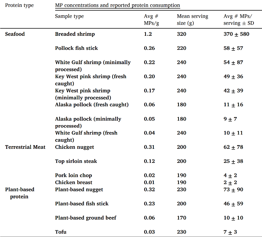 Researchers analyzed 16 different types of protein products commonly consumed in the U.S., including seafood, beef, pork, chicken, tofu, and plant-based meat alternatives. The study aimed to determine how microplastic contamination occurs in these foods and how many particles the average person consumes. The study found that microplastics were present in all 16 types of proteins and in 88% of the individual samples tested. They found that highly processed meats contained significantly more microplastics than fresh or minimally processed ones. Interestingly, there was no significant difference in the concentration of microplastics found in meat from land animals compared to seafood. Included below is a portion of the table from the study that highlights each meat tested, and the microplastic concentrations observed.